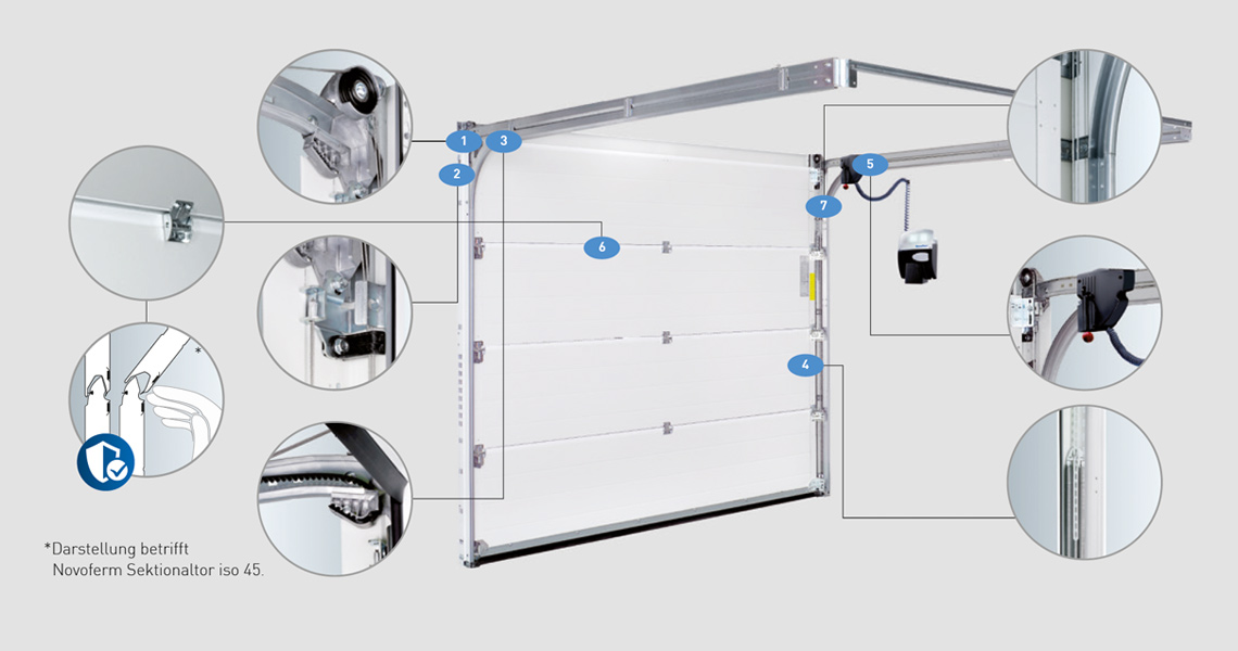 Die spezielle Konstruktion der Sektionen und Scharniere schließt Quetschstellen am Torblatt von vornherein aus. Bei Novoferm ergibt sich auch auf der Innenseite keine Klemmstelle.