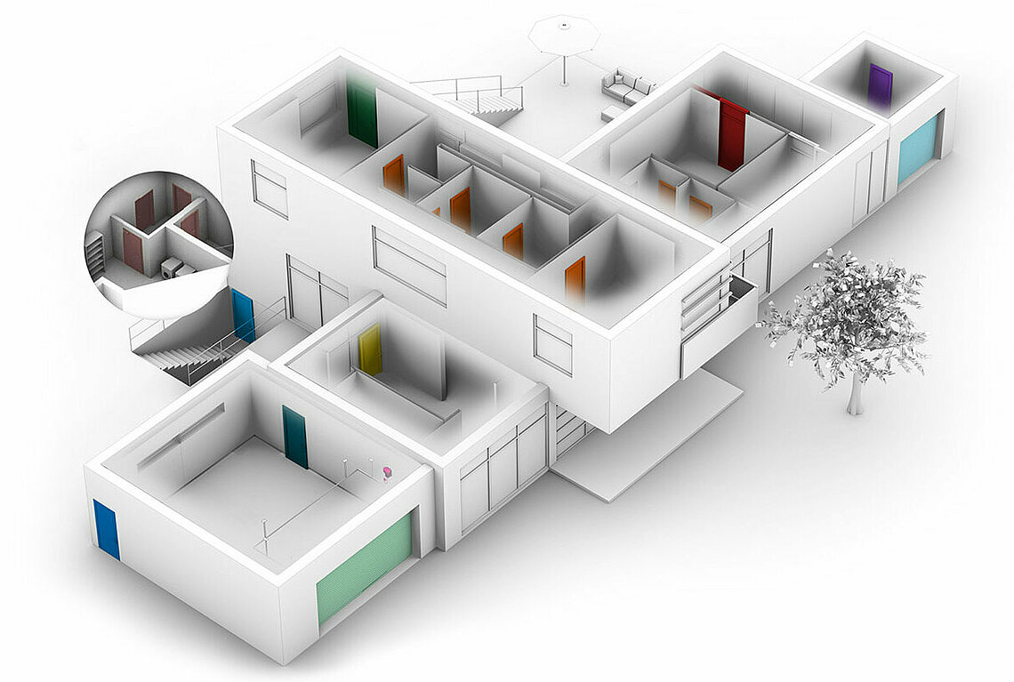 Das animierte 3D-Gebäude soll mögliche Anwendungsbeispiele von ausgewählten Novoferm Produkten veranschaulichen und erhebt nicht den Anspruch auf Berücksichtigung aller baurechtlichen Anforderungen (z.B. Brandschutz, Rauchschutz, Einbruchschutz, Schallschutz, ...).