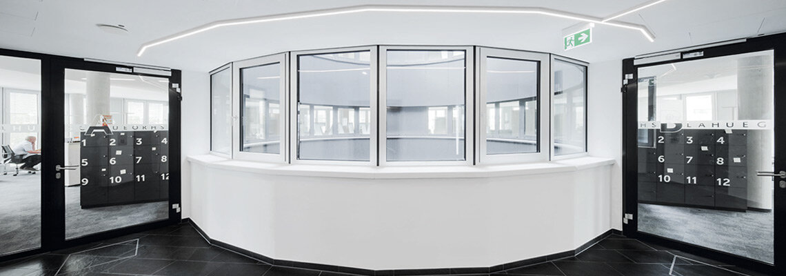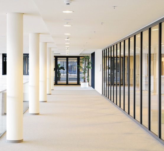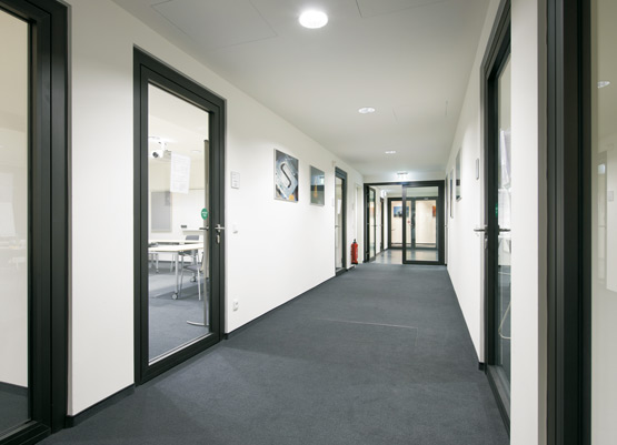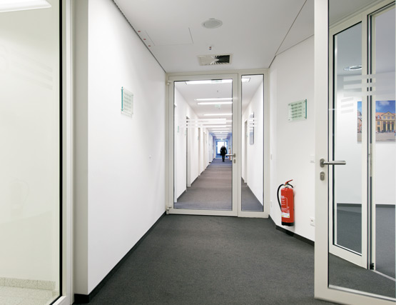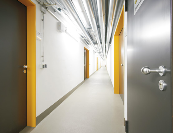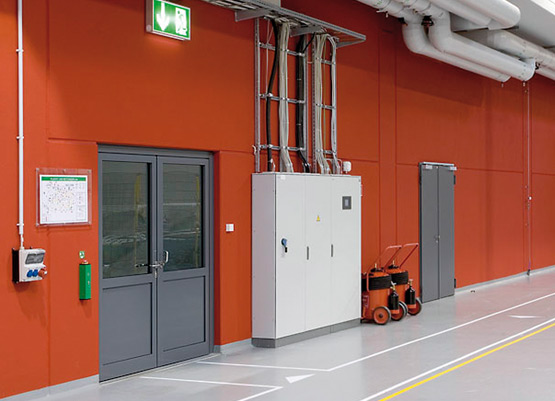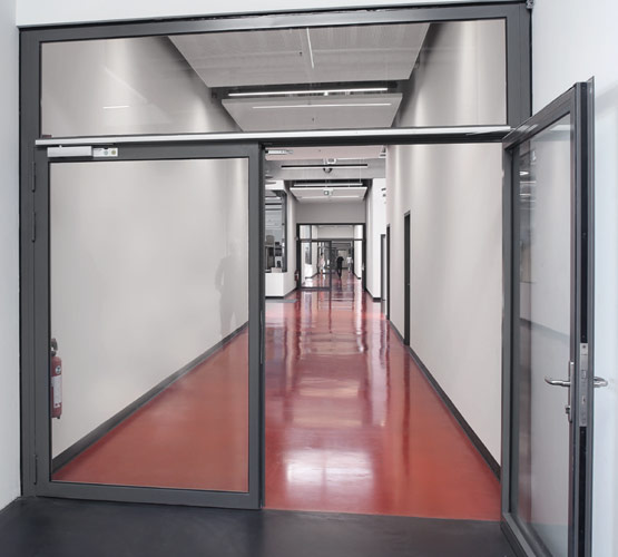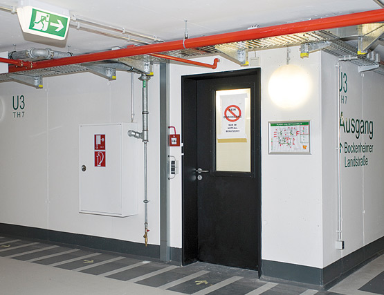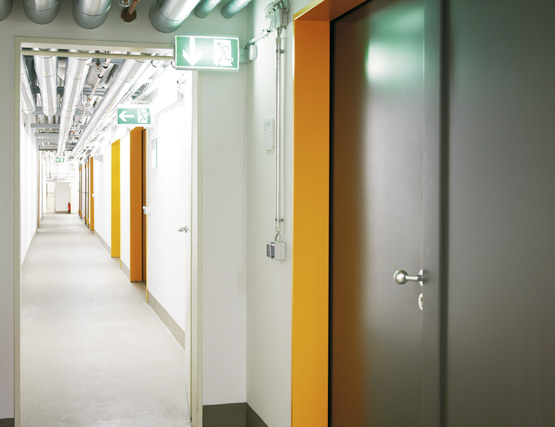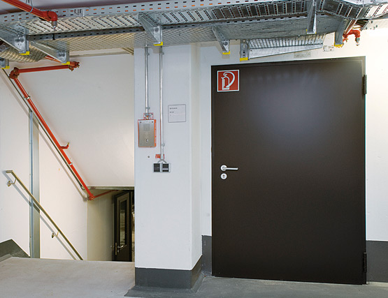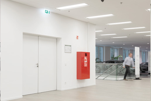 Moderne Industrie- und Gewerbebauten müssen den Vorschriften des betrieblichen Brandschutzes entsprechen. Ein Feuer kann zum größtmöglichen Schaden führen. Daher stellt die richtige Organisation des Brandschutzes für Unternehmen einen zentralen Baustein im Sicherheitskonzept dar. Hierzu zählen insbesondere Feuerschutz- Türen und Tore, die im Ernstfall einzelne Gebäudeteile sicher voneinander trennen oder auch als Gebäudeabschluss dienen. Im neuen Audi Terminal wurden diese Anforderungen durch den Einsatz hochwertiger Stahlblechtüren erfüllt. In sämtlichen Brandschutzabschnitten, beispielsweise zwischen den Lagern, den Werkstattbereichen, den Ausstellungsräumen, der Verwaltung oder auch zur Abschottung der Treppenhäuser, kamen bedarfsgerecht konfigurierte Brand und Rauchschutztüren von Novoferm zum Einsatz. Diese überzeugten die Auftraggeber mit hoher Qualität, großer Funktionalität und einer attraktiven Gestaltung.
