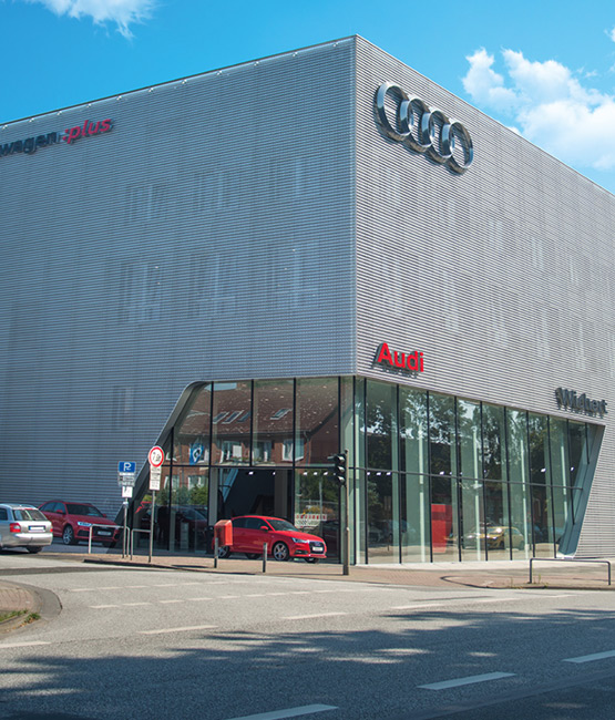 Architektur als Markenkommunikation In Hamburg an der Langenhorner Chaussee eröffnete jetzt ein ganz neues, stylisches Audi Terminal. Seine Gestaltung mit den hohen Glasfronten und den Fassaden-Asymmetrien ist Teil einer weltweit wiedererkennbaren Architektursprache. Ein starkes Symbol Audis progressiver Markenbotschaft.