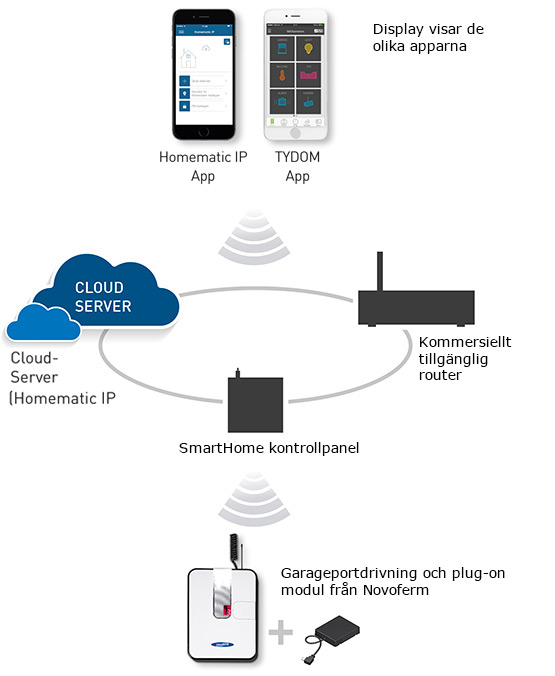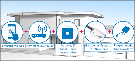 För att få ut så mycket som möjligt av din takskjutport och öppnare från Novoferm så behöver du även en passande app från en av våra SmartHome-partners. Så att du kan använda appen för att styra din garegeportöppnare så kopplas den upp till SmartHome-centralen och extramodulen från Novoferm via en vanlig router. Systemet är lätt att installera via smartphone-appen från en av våra partners. Apparna är gratis och de är tillgängliga för Apple och Android.