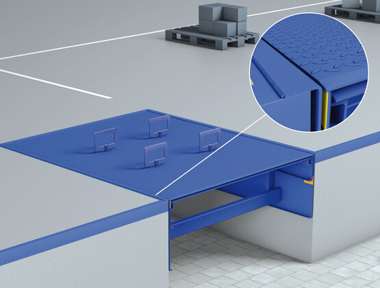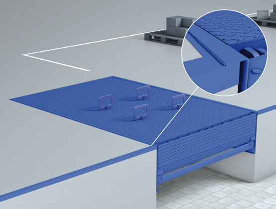 Vinkelramarna på sidorna passar in på den existerande stålramen och kan svetsas fast efter att de passats in. Den bakre platta ramen av stål ger en steglös övergång från hallgolvet till den nya lastbryggan.