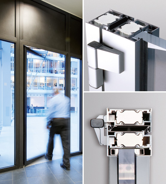 Spärrlås, förberedd för profilcylinder, handtags- resp. växeluppsättningar kan väljas med oval rosett i aluminium, rostfritt stål eller plast. Det stående bladet hålls på plats av ett övre lås med en falsregel, alternativt med nödöppningsfunktion enligt DIN EN 179 eller DIN EN 1125. Takskjutdörrsstängare med glidskenor enligt DIN EN 1154, t.ex. GEZE TS 5000/Dorma TS 93, integrerade dörrstängarsystem (Dorma ITS 96) för RS och T30, drivenhet för vridbladsdörr enligt DIN 18263/DIN 18650.