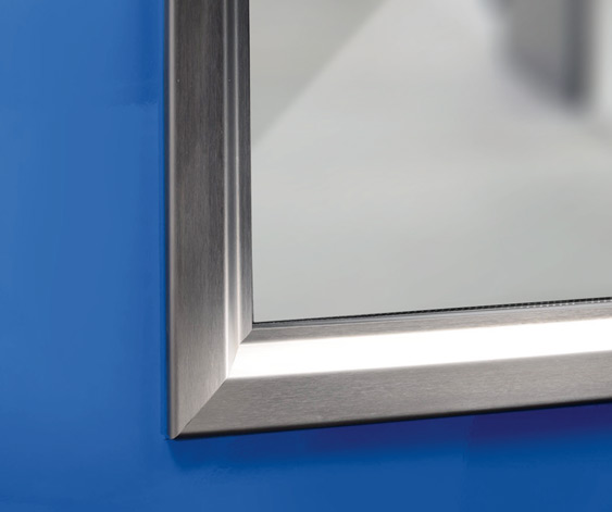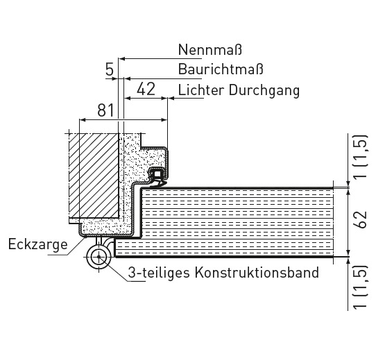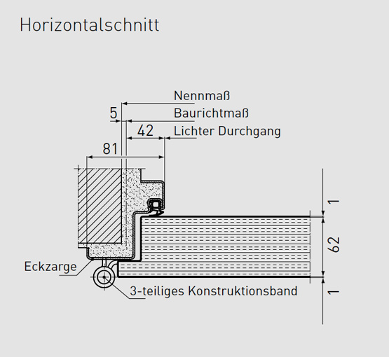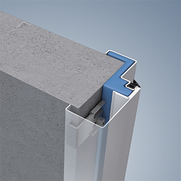 Standard: Eckzarge mit dreiseitigem CR-Dichtungsprofil, 2,0 mm dick, Spiegelbreite 50 mm, wahlweise Umfassungszarge, zweiteilige Umfassungszarge Profil 2140B, Gegenzarge sowie Blockzargen für stumpfen Wandanschluss.