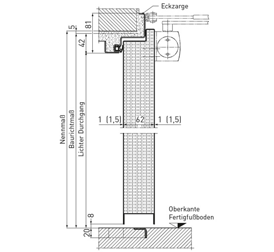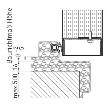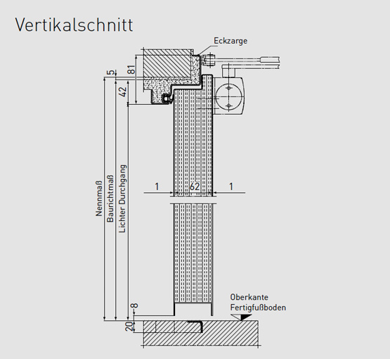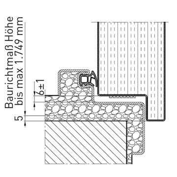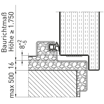 Standard A fußbodeneben, wahlweise B2, BE-2, B3 mit vierseitig umlaufenden Rahmen oder C2 mit unterem Anschlag und Dichtung oder Dichtschwellen RS1 mit absenkbarer Bodendichtung oder doppelter Schwelle RS1.